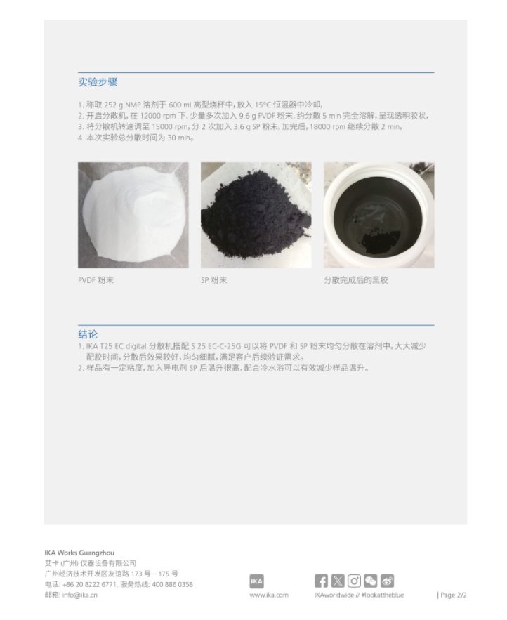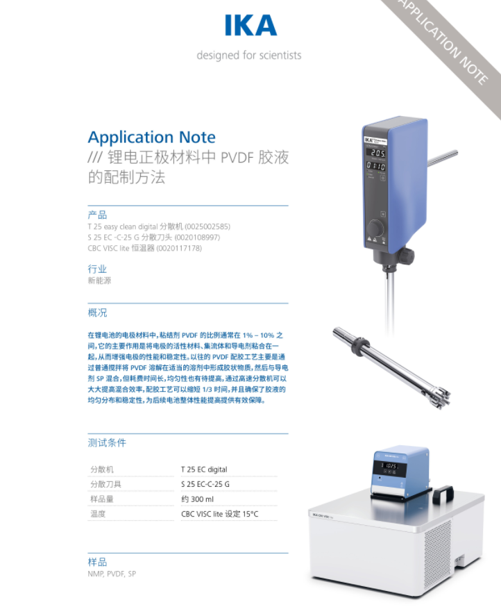 《锂电正极材料中 PVDF 胶液的配制方法》。在锂电池的电极材料中,除了正负极关键材料的制备,PVDF配胶工艺也至关重要,PVDF的主要作用是将电极的活性材料、集流体和导电剂粘合在一起,从而增强电极的性能和稳定性。附件提供了一种快速且高效的配胶方法,请大家关注此类应用!